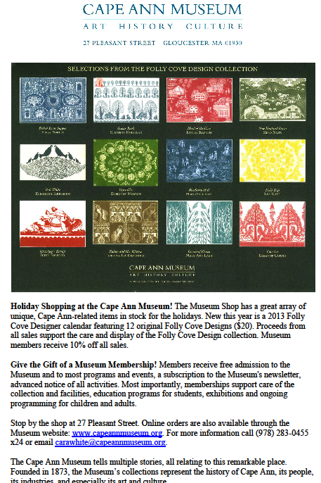We’re trying to get the word out about the new Folly Cove Calendar available in the shop for a limited time. Attached is the info in pdf form. We’d be grateful if you had a spot for it on the blog. Thank you, and have a great day!