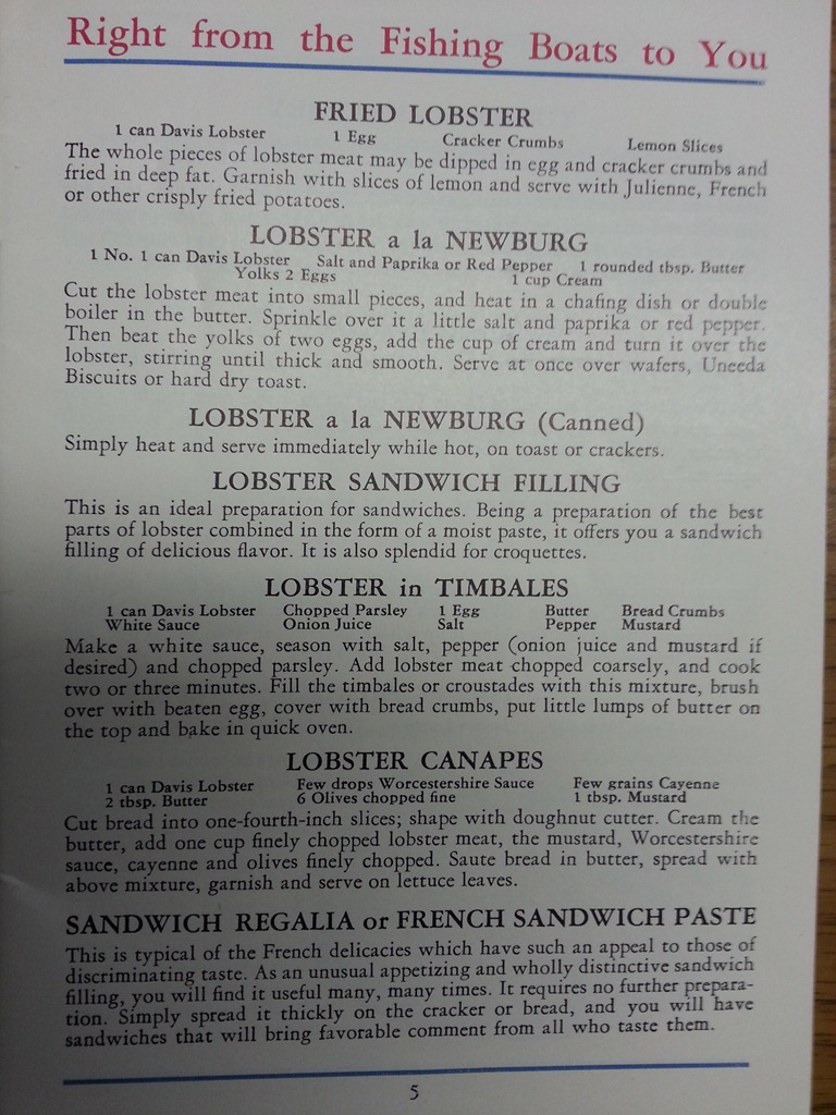 Old Gloucester Sea Food Recipes Circa 1932 Frank E Davis Fish Co Part 4- Lobster