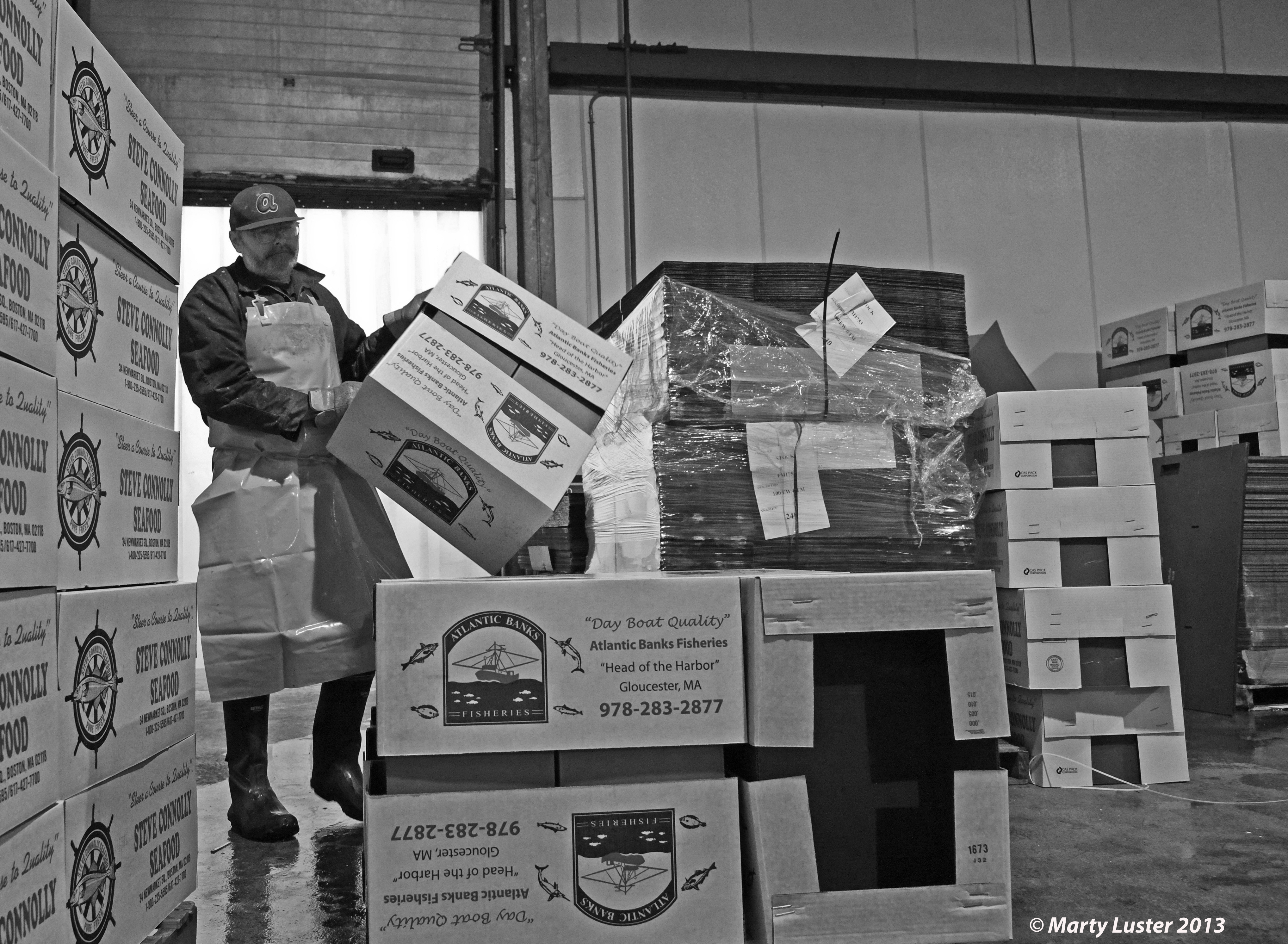 Mike, at Atlantic Banks Fisheries, sorts and boxes a catch.