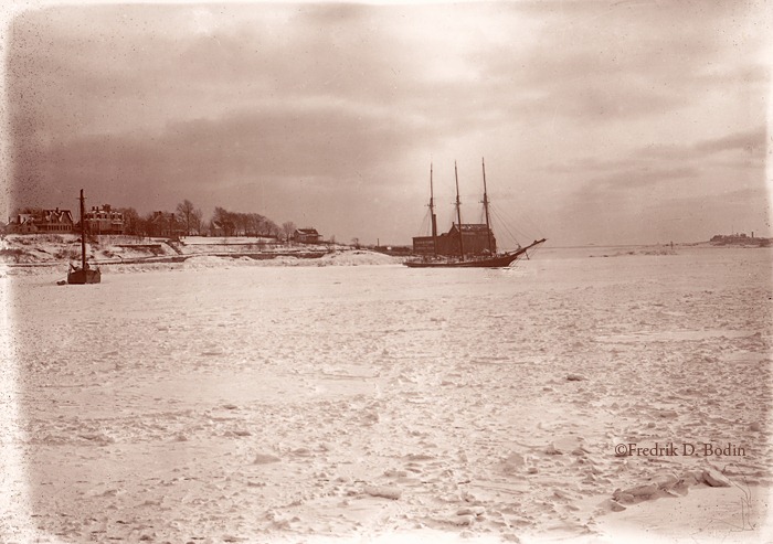 This 5×7 inch glass negative was part of a panorama, that swept to the right to include Downtown and the Fort. At the time, horse–drawn wagons would transport fishermen to the ships and fish back to market. In my 33 years here, I saw the harbor frozen once. Being a foolish young man, I walked from the Old Yacht Club on Rocky Neck about 1/4 of the way out to Ten Pound Island. I turned around and creeped back. Lesson learned.