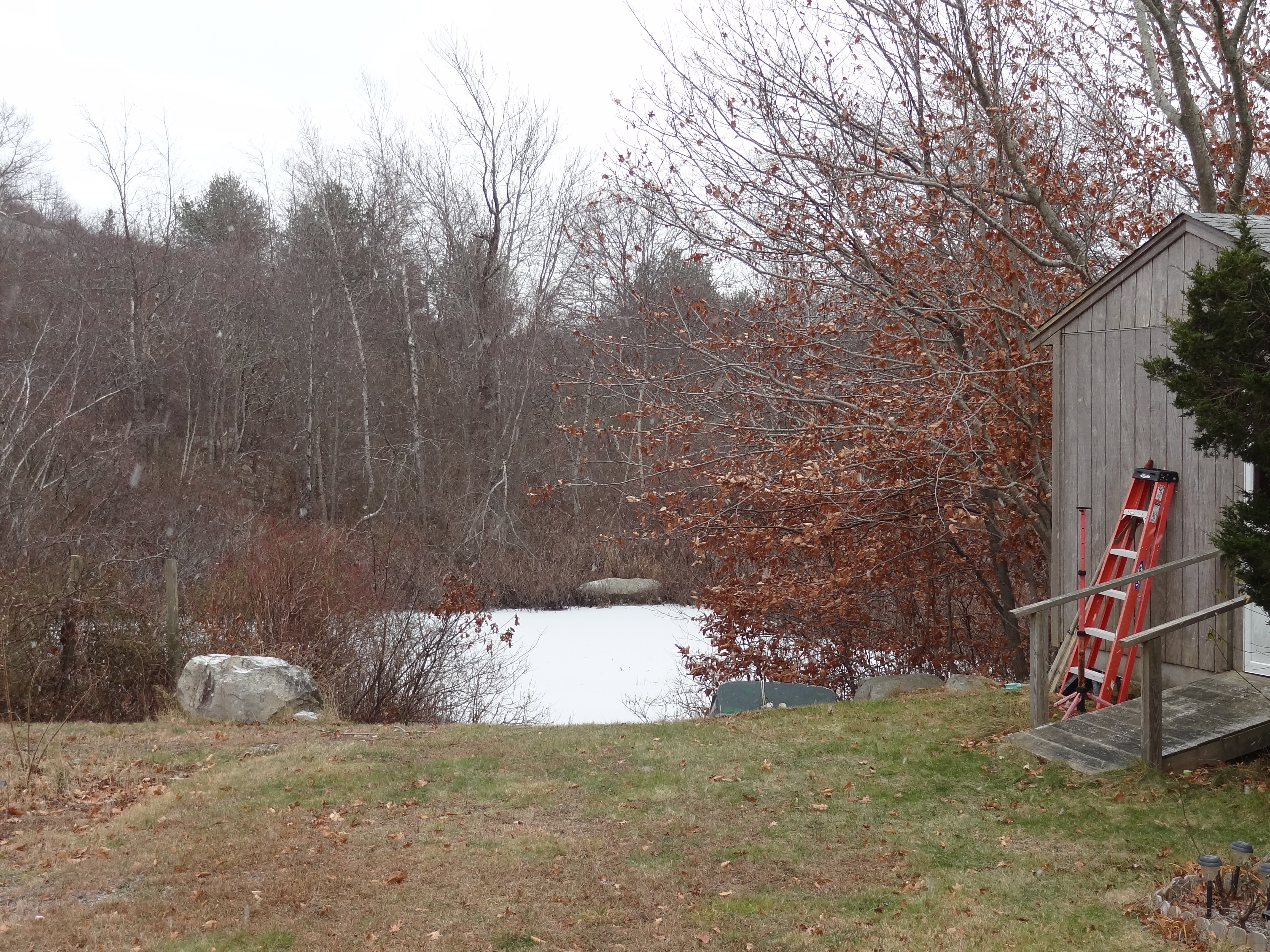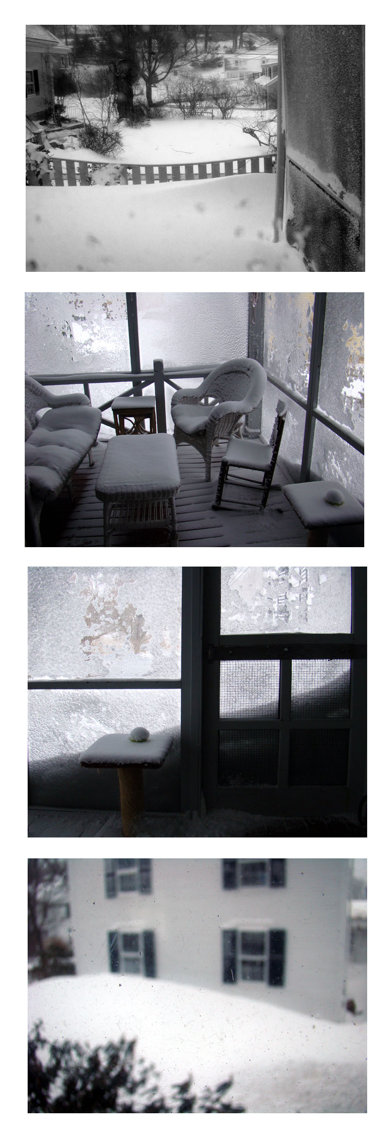 On top of losing power and internet connection, which just came back, I couldn’t get out of my house, so this is the best I could do. View of my walkway with 4′ of snow covering it, snowed in screen porch with the snow piled up against the door. My neighbor, Sarah Hackett, had bare ground showing on part of her yard, and snow up to her windows. And it’s still snowing! My neighbor Jen Nicol came over the cleared my door, so I can get out to try to clear the 6′ of snow that has drifted up behind all our cars at the top of the Union Court. Things you can’t help but love about living in New England.