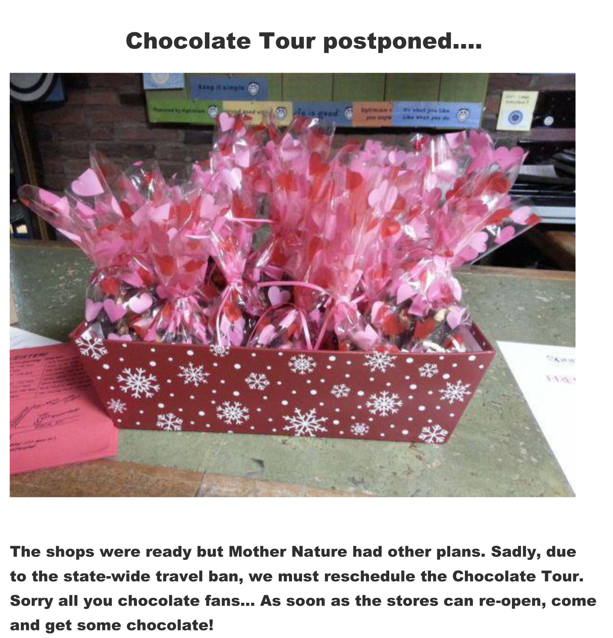 GLOUCESTER CHOCOLATE TOUR UPDATE- Chocolate tour is on for Sunday 12-5. PLEASE come down and share your blizzard stories and eat chocolate! If you can’t find your map, we still have lots! It’s going to be delicious!