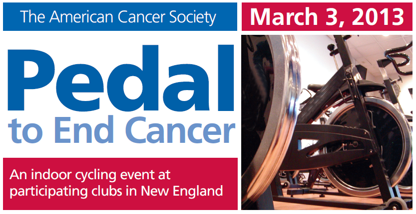 On March 3, 2013, we will be joining over 85 clubs across New England hosting the American Cancer Society’s 9th annual Pedal to End Cancer event. In the last eight years, Pedal to End Cancer has raised over $2.2 million to benefit the American Cancer Society’s programs of cancer research, education, advocacy and patient services.