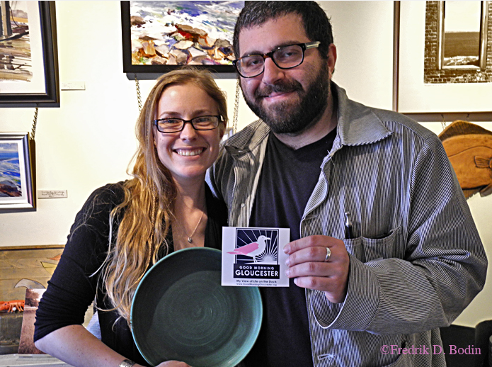 Ellie Grose of Manchester (MA) and Amier Carmel of Brooklyn (NY) came into my gallery this afternoon. Ellie is an old friend of my potter, Kristen Brousseau of Costa Rica. I gave Ellie the green plate she’s holding in the photo. Amier, born in Manhattan and now living in Brooklyn, is a frequent visitor to Cape Ann. He watched the second plane hit the World Trade Tower and the collapse of the building. Being a licensed social worker, he went directly to the scene and offered all assistance he could. His story took my breath away, and I’ll video the story for you this summer. Great folks!