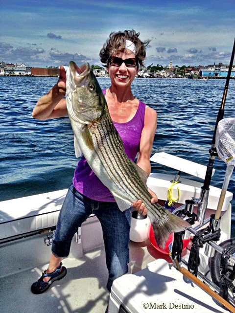 This is Laura, a native of Cleveland, Ohio, and first time visitor to Gloucester, hosted by colleague and friend Mark Destino (https://goodmorninggloucester.wordpress.com/2012/08/15/who-is-this-dude/). They both work at Cleveland’s Ronald MacDonald House. She and Mark went out on his Uncle Jimmy’s (Destino) boat "Tuna & Egg" (named after a popular sandwich from Destino’s Subs in Gloucester). Her first lifetime cast into salt water resulted in a trophy striper measuring 34". She yelled: "Fish On!" I say: "Sign her up!" I’m thinkin’ she’s now a Glosta’ girl.