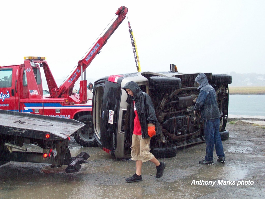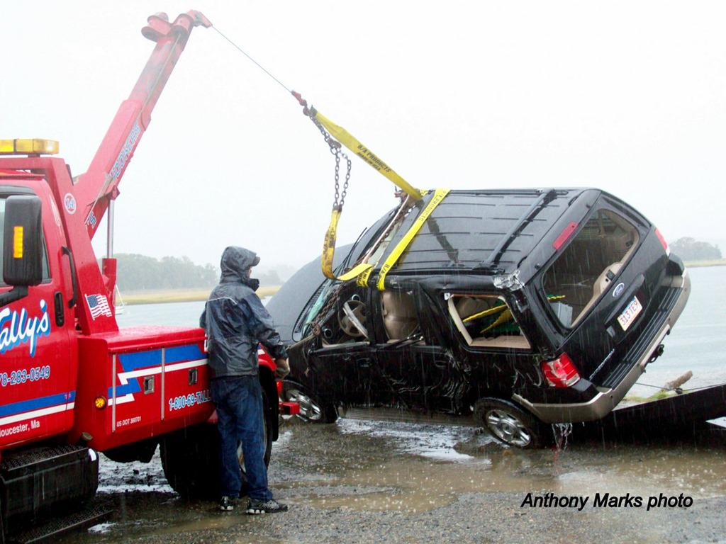 The harbormaster was at the scene to help get the vehicle out of the water.