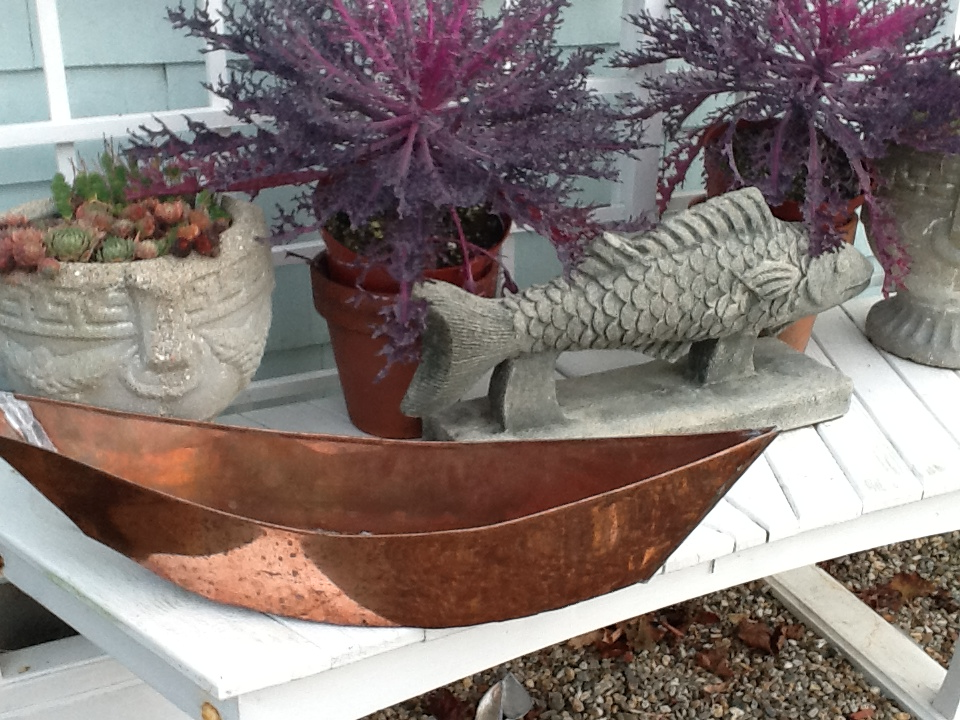 A couple days later my husband and I were walking along Shore Rd. in Magnolia and came upon a local man in his truck pulled up on the side of the road. We didn’t know his name but we see him on our daily walks, enjoying his coffee and newspaper at Magnolia Beach. As we approached he called out, “That’s for plants.” Upon realizing that he was the creator of this beautiful dory, we introduced ourselves. His name is James (Jim) Fialto. He’s a coppersmith. Apparently he had just heard that we lost our sign, and had some free time on a Sunday afternoon waiting for the Patriots game to begin. When asked why he made us the dory, he said, “I felt bad about your sign being stolen and I see you picking up trash every day on your walk…”