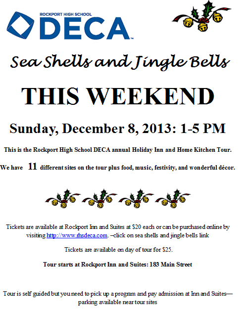 Tickets are available at Rockport Inn and Suites at $20 each or can be purchased online by visiting http://www.rhsdeca.com. –click on sea shells and jingle bells link