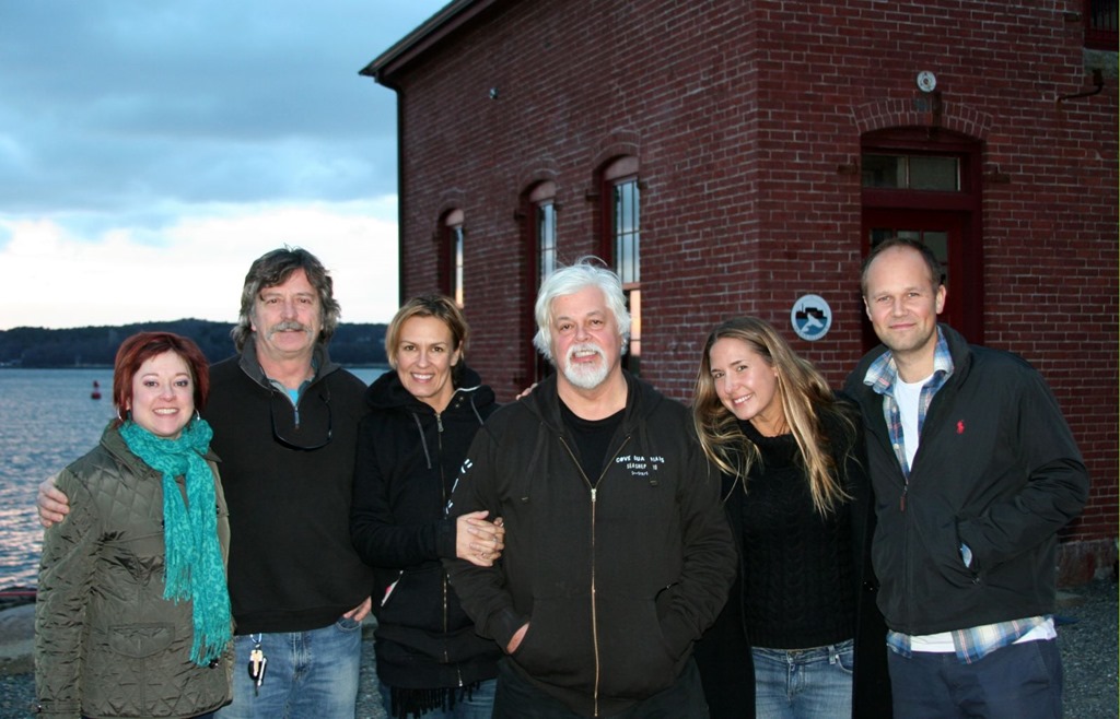 (Pictured: OA staff members Rebecca Siswick, Mark Hayes and Andy Rogan; Sea Shepherd crew Quartermaster Shannon Mann, Captain Paul Watson, and Deborah Bassett; photo by John Graham)