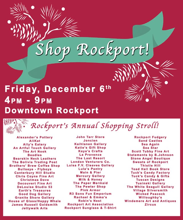 Stroll Rockport’s Christmas tree-lined streets during our Annual Shopping Stroll – THIS FRIDAY! More than 60 merchants will be offering promotions, discounts, raffles and refreshments to light-up the Holiday shopping season!