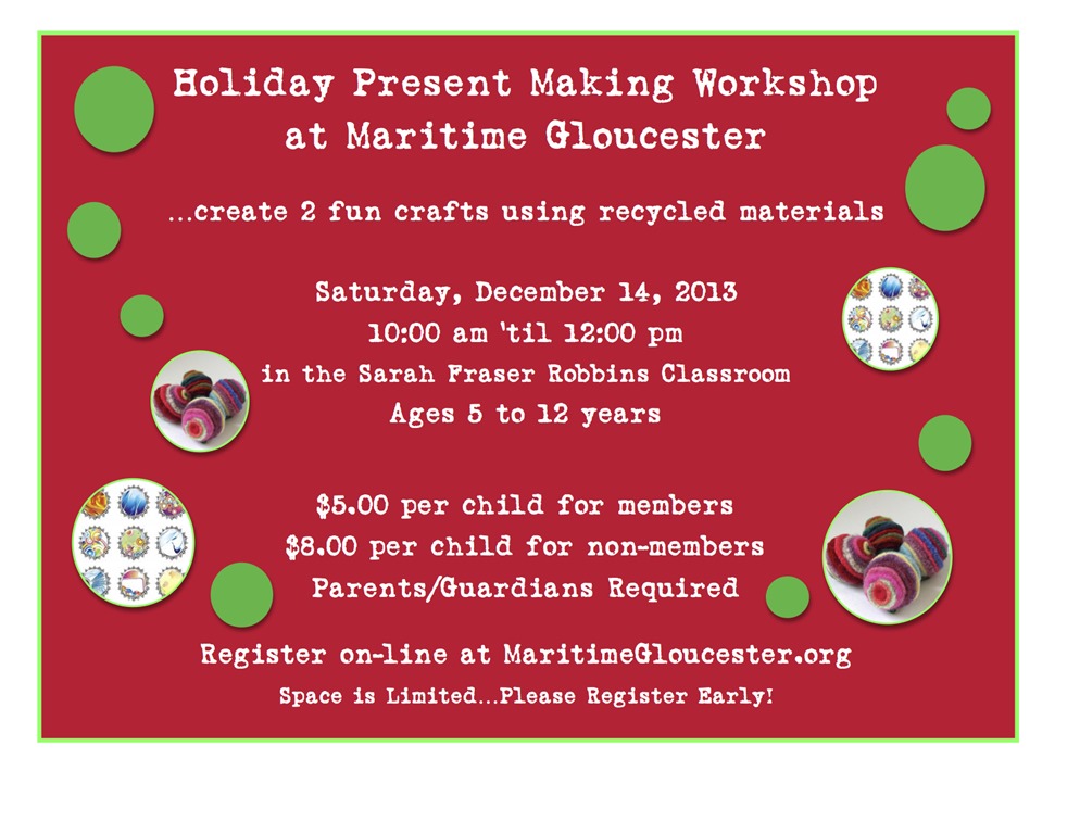 Work with Maritime Gloucester staff to create two fun crafts using recycled materials. Ages pre-K through 12 years. Parent or guardian attendance required (fee is per child only). Event runs from 10:00 to noon. Register here: http://maritimegloucester.org/visit/event.php?s=2013-12-14-holiday-present-making-workshop
