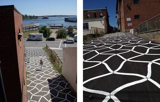 Boston, MA: September 19, 2013 photo © Mike Springer / Gloucester Daily Times, “Taking art to new heights; local painters carry out high levelBoston project”. Matthew Ritchie’s Remanence: Salt and Light (through fall 2014), is the 2nd temporary mural on the Dewey Square ventilation building, commissioned for the Institute of Contemporary Art/Boston and Rose F. Kennedy Greenway Conservancy, and made possible by the MA Department of Transportation, Boston Arts Commission, and City of Boston, and private donations and support.Rockport, MA: In 2013, there was more local awareness for “temporary” public art. In Rockport, MA, artist and architect–and HarborWalk Public Art Challenge semi-finalist for Then and Again, a proposal for a temporary winter installation–Rob Trumbour secured the OK to design a site-specific summer installation with his Wentworth architectural students (Artforming Summer Build). See a detail from the installation at historic LumberWharf, Rockport.