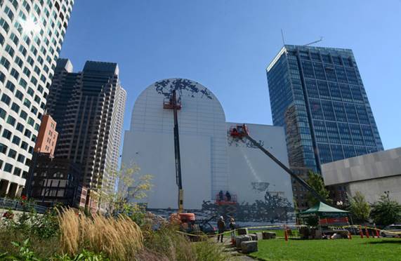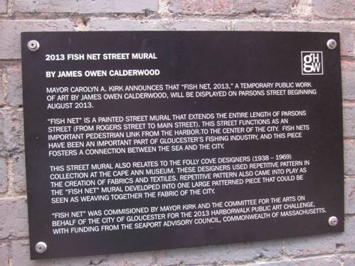 Gloucester, MA: At the direction of Mayor Kirk, Gloucester commissioned 3 contemporary artists for new public art with funding support from the Seaport Advisory Council, Commonwealth of Massachusetts. Artist James Owen Calderwood completed the 300’ Parsons Street mural, Fish Net, which was selected as one of the extraordinary public space examples at Ma Smart Growth Alliance ABX placemaking booth (photo above).Cambridge Seven Associates architects designed the Gloucester HarborWalk. Artists Justin Desilva (RISD) and Bartek Konieczny (MA College Art & Design) are currently at work on their winning Gloucester HarborWalk Public Art Challenge awards. Tricia O’Neill / Signs unique fabricated the gHW plaque and has a connection to the next public art listed; she’s painting from the crane.Boston, MA: September 19, 2013 photo © Mike Springer / Gloucester Daily Times, “Taking art to new heights; local painters carry out high levelBoston project”. Matthew Ritchie’s Remanence: Salt and Light (through fall 2014), is the 2nd temporary mural on the Dewey Square ventilation building, commissioned for the Institute of Contemporary Art/Boston and Rose F. Kennedy Greenway Conservancy, and made possible by the MA Department of Transportation, Boston Arts Commission, and City of Boston, and private donations and support.