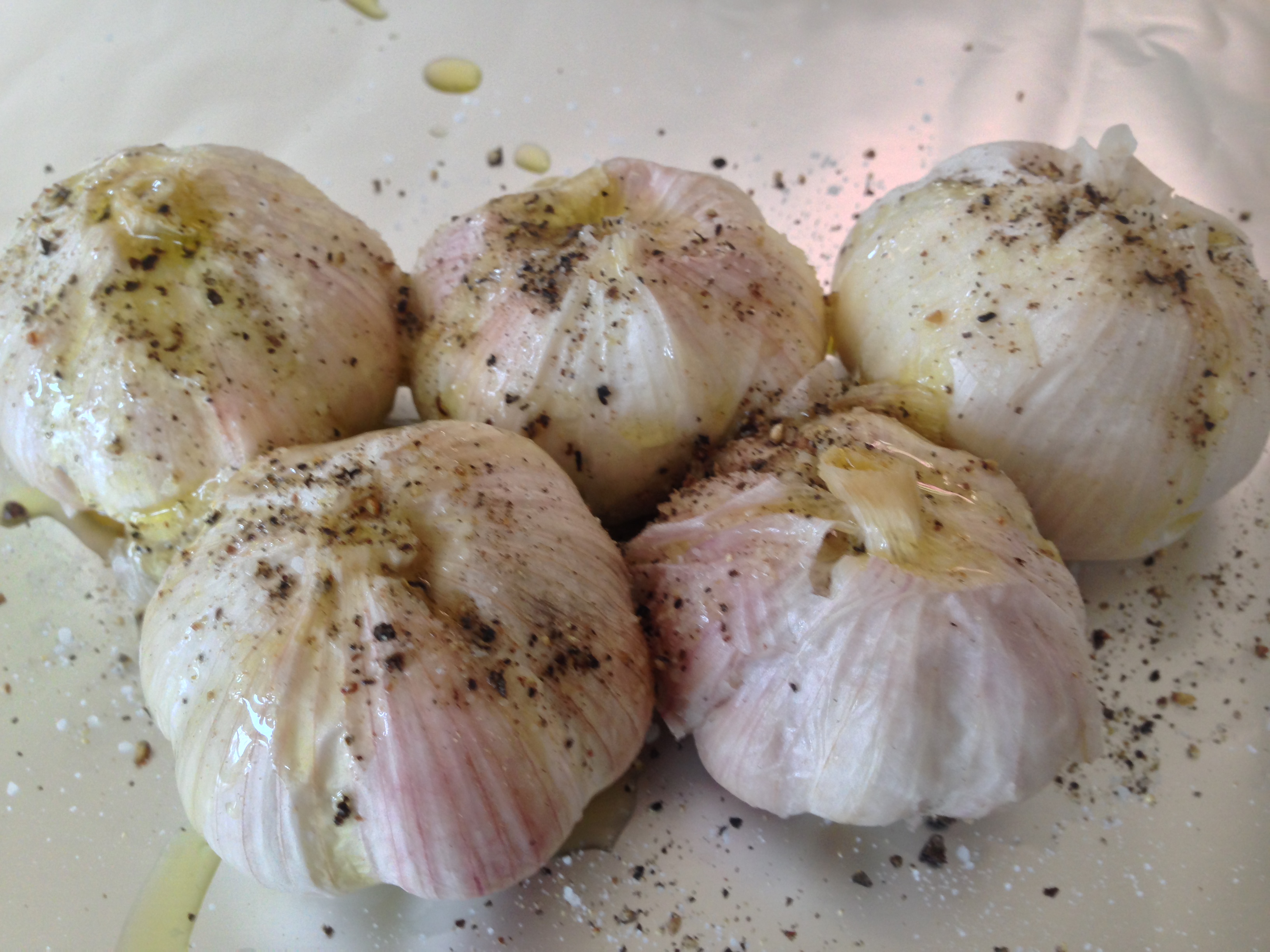 1 place garlic heads in center of aluminum foil sheet; drizzle heads with 3 tablespoons olive oil; season with 1/2 teaspoon salt and pepper