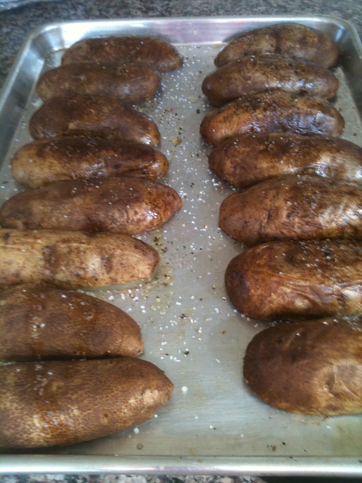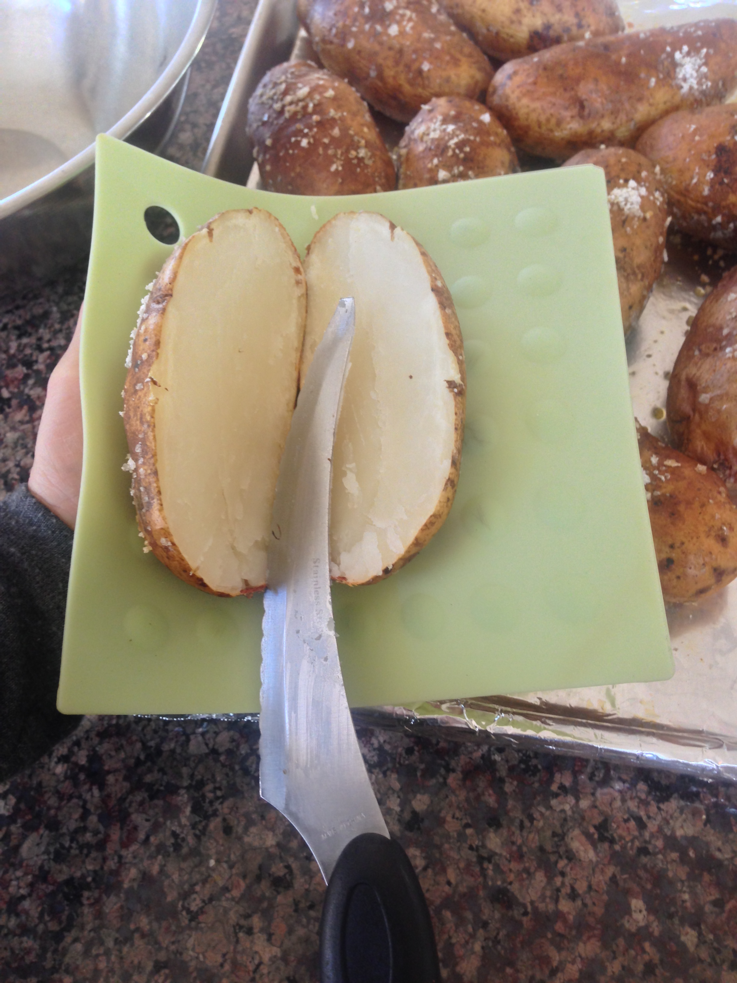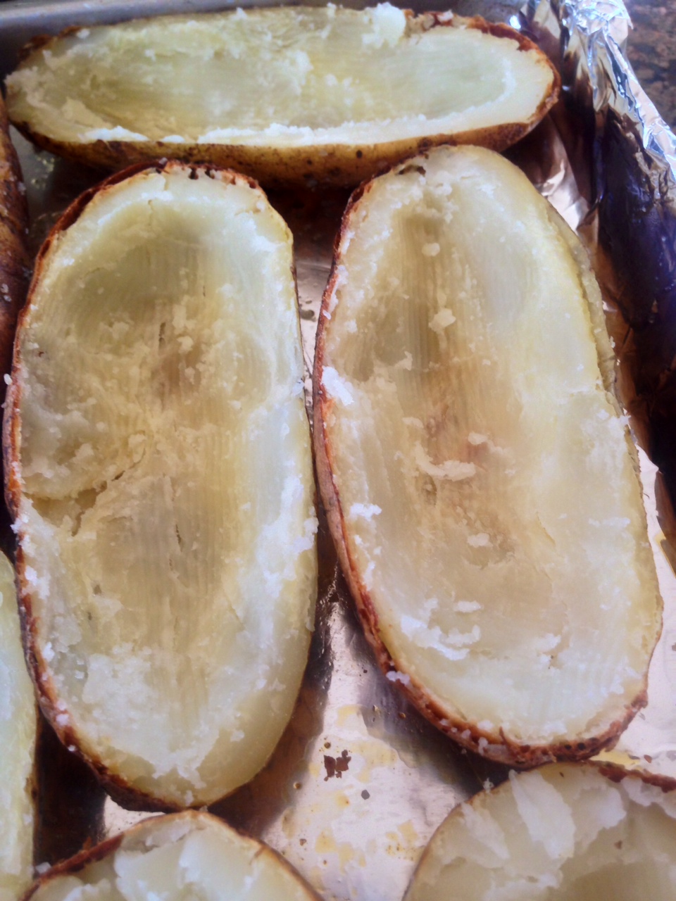 3 remove potatoes from oven; slice in half; using a grapefruit spoon scrape flesh of potato from each half reserve potato flesh in separate bowl (be sure to leave 1/4 inch flesh in skin); place hollowed potato half’s right side down on cookie sheet; bake hollowed skins 8 minutes in 400 degree oven