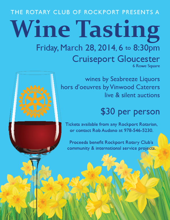 The Rockport Rotary is hosting a Wine Tasting event at Cruiseport on March 28th. We would like to announce it to Cape Ann and thought you might be willing to include it on GMG next week. It should be a fun night and a much needed spring break from this cold winter weather. The proceeds will benefit our community and international service projects.