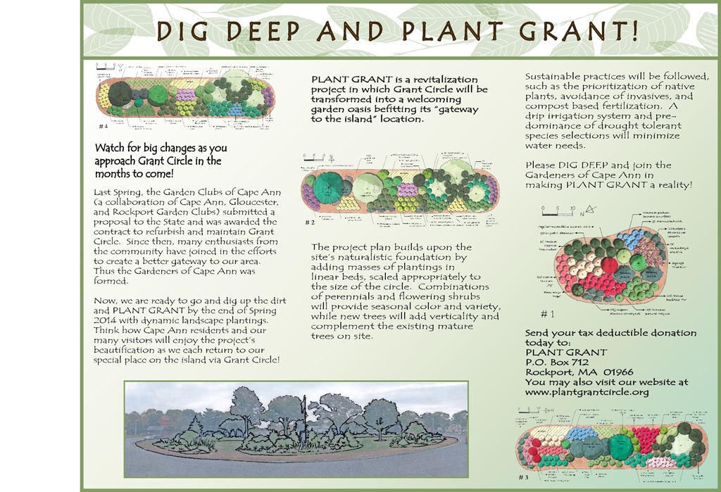 Please “DIG DEEP” NOW to insure the success of this project. Meeting our fundraising goal will allow planting to begin by late May. Let us band together to create a meaningful legacy to ensure Grant Circle becomes an enduring source of beauty and pride for our entire community. Tax-deductible donations can be sent to: Plant Grant, PO Box 712, Rockport, MA 01966. Visit our website: www.plantgrantcircle.org and “LIKE” us on our Facebook page: Plant Grant Circle. Thank you!