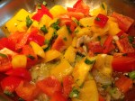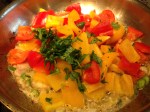 5 melt 3 tablespoons unsalted butter in medium size fry pan over high heat; add shallots, scallions and 1/2 teaspoon freshly ground pepper; sauté 2 minutes; add red and yellow peppers; sauté three minutes; add fresh cilantro; remove from heat; reserve pepper mixture