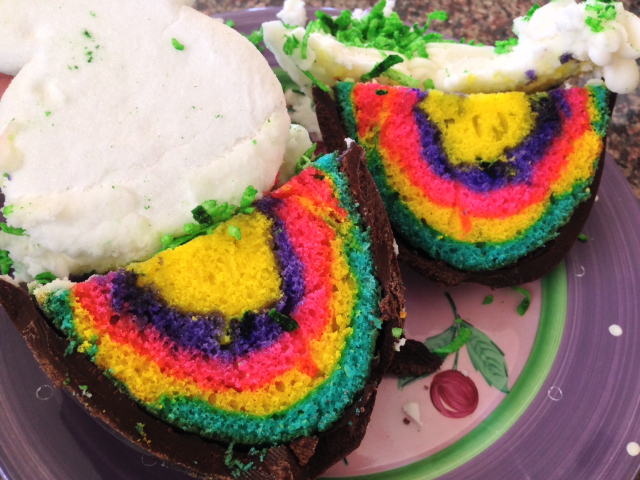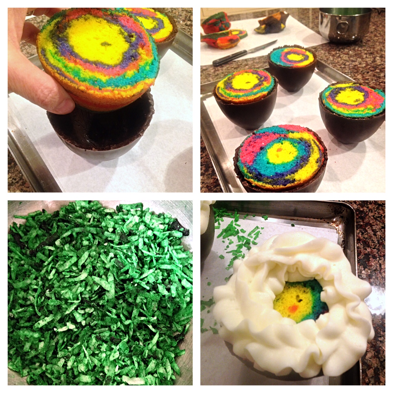 6 fill ¾ of each Easter Egg section of baking pan, by layering each colored cake batter in each egg section; bake until fully cooked (follow box instruction for cupcakes for baking times)