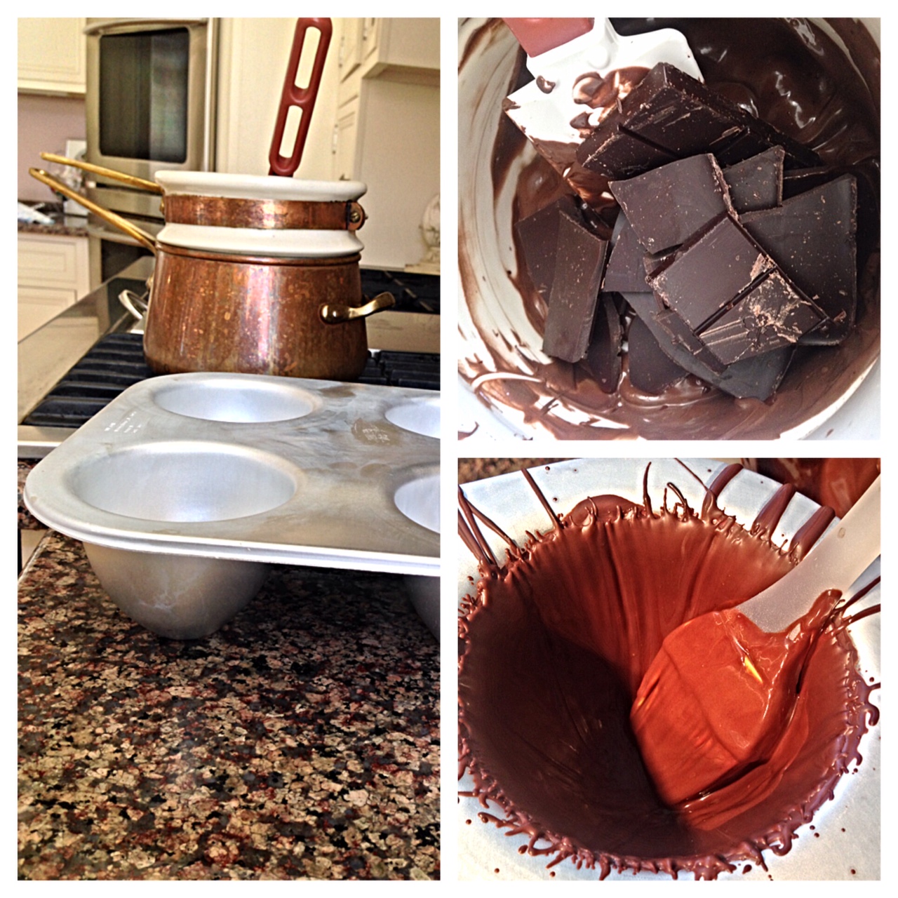 1 chill four section half Easter Egg Baking Pan in refrigerator 15 minutes; melt chocolates in double boiler pan