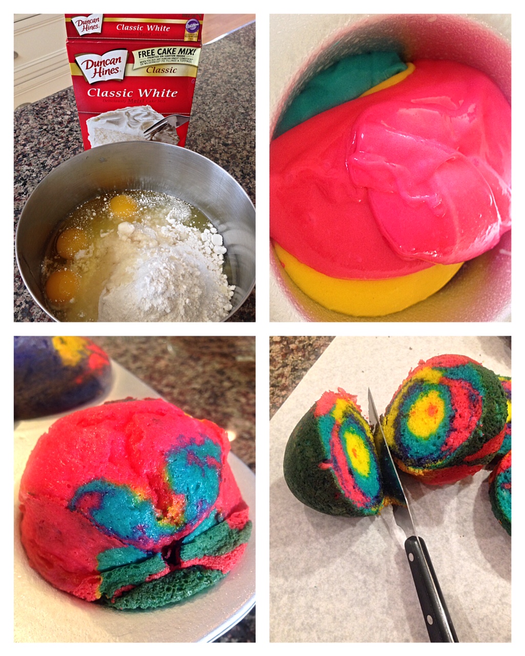 5 mix cake batter according to box instruction; evenly divide batter into 4 separate bowls or large cups; mix one food coloring into each