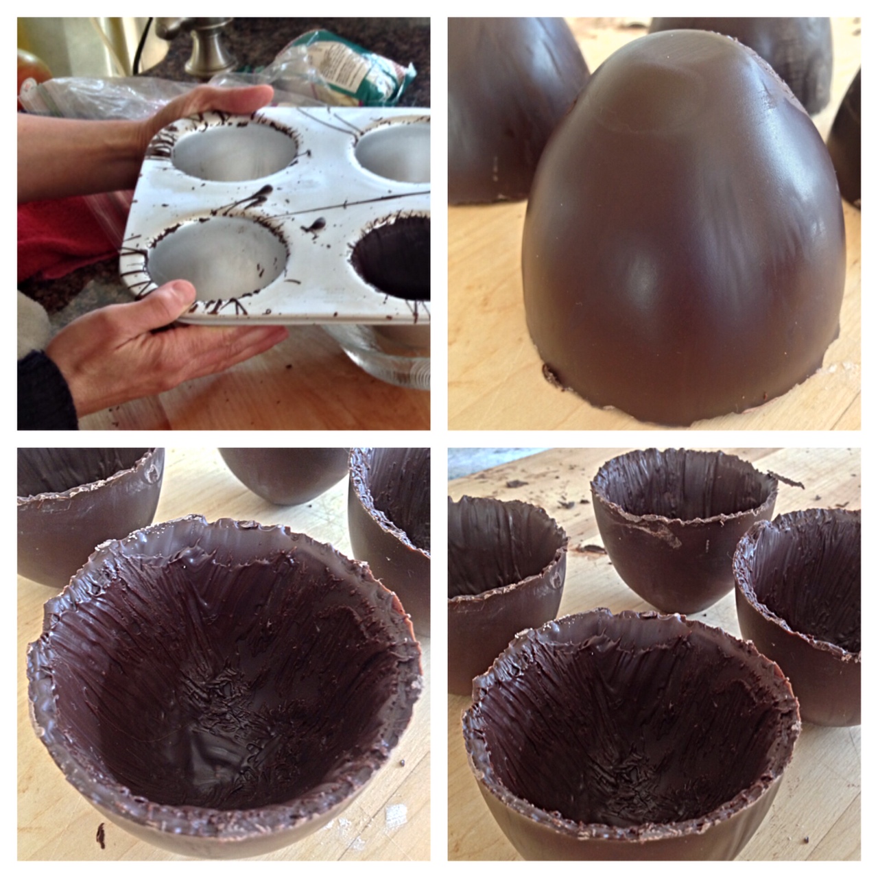 4 fill small cereal bowl with warm water; dip bottom side of pan with chilled molded chocolate in bowl of warm water 10 seconds; gently tap pan on counter and remove chocolate egg from mold; repeat with remaining 3 chocolate egg molds in pan; chocolate eggs should stand freely; reserve chocolate eggs