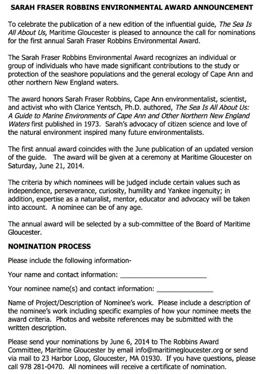 Sarah Fraser Robbins Environmental Award-Call for Nominations
