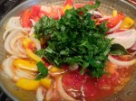 1 Heat olive oil in Cataplana over high heat; add garlic, garlic scapes, and bay leaf; sauté one minutes; add peppers onion; sauté 30 seconds
