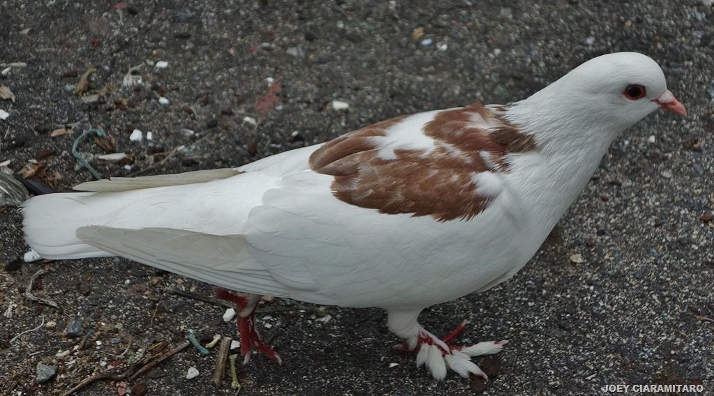 Looking across the parking lot at the dock I saw what looked like a white seagull bopping back and forth in the parking lot. Upon further inspection it was this pigeon. Note the white hair/feathers on its talons (is that what you call them when they’re on a pigeon, or do you call them feet or something else?) Talons sounds a little too aggressive for a white pigeon but WTF do I know about pigeons?