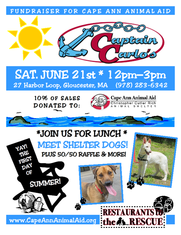 Captain Carlo’s is hosting a lunchtime fundraiser for Cape Ann Animal Aid as part of the Restaurants to the Rescue Fundraising Series on Saturday, June 21st. 10% of all sales between 12pm and 3pm will be donated to Cape Ann Animal Aid. The event will also feature a 50/50 raffle, great prizes, and a meet and greet with shelter dogs. For more information or to make a reservation, call 978-283-6342.