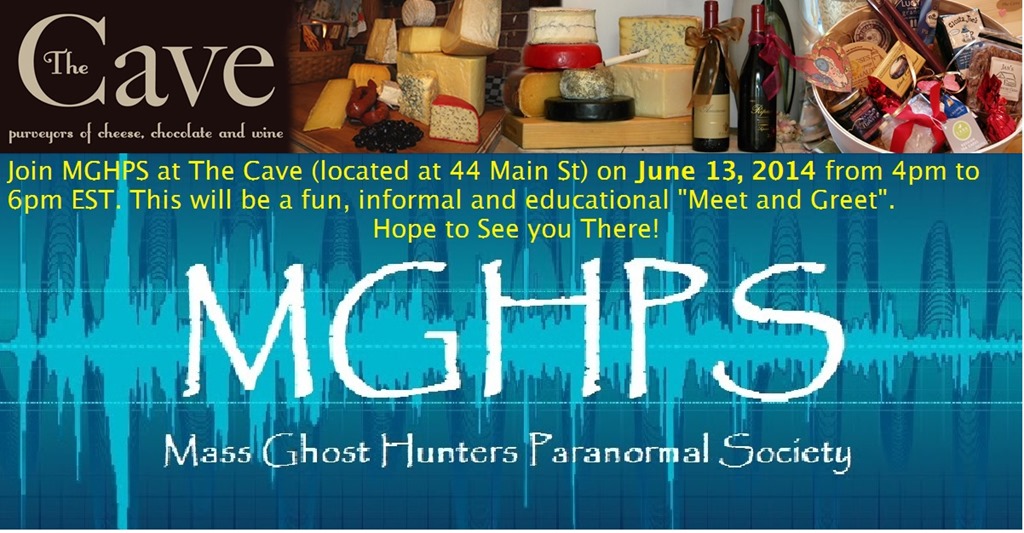 Laura asked that I send you a little something about a meet and greet she is hosting this Friday the 13th. We (Mass Ghost Hunters Paranormal Society) will be at The Cave from 4pm to 6pm. This will be an informal meet and greet where we will be available to tell stories and answer questions about all things “Paranormal”. We will have some of our equipment available for demonstration and explanation purposes. We look forward to seeing everyone there. Visit us at www.mghparanormal.com orwww.facebook.com/mghparanormalsociety