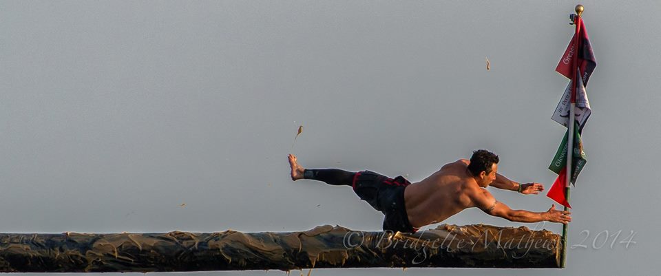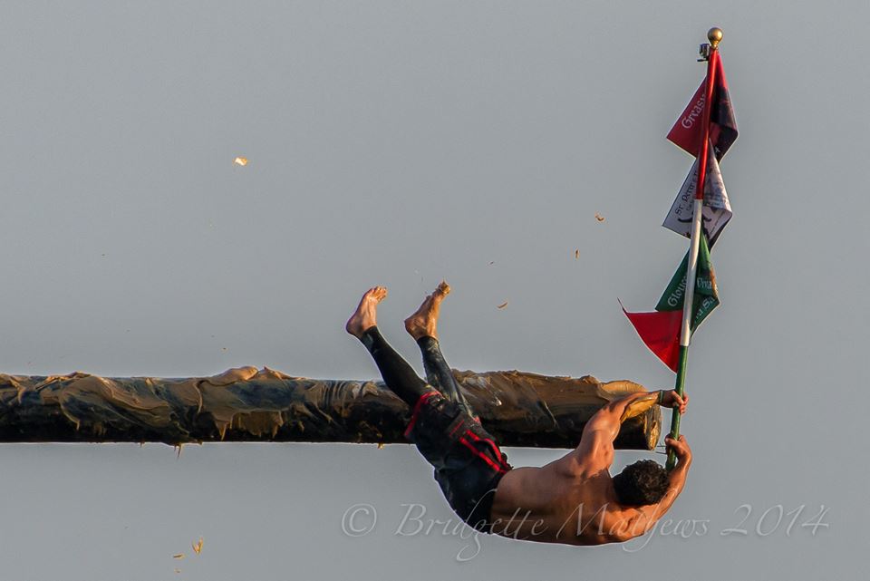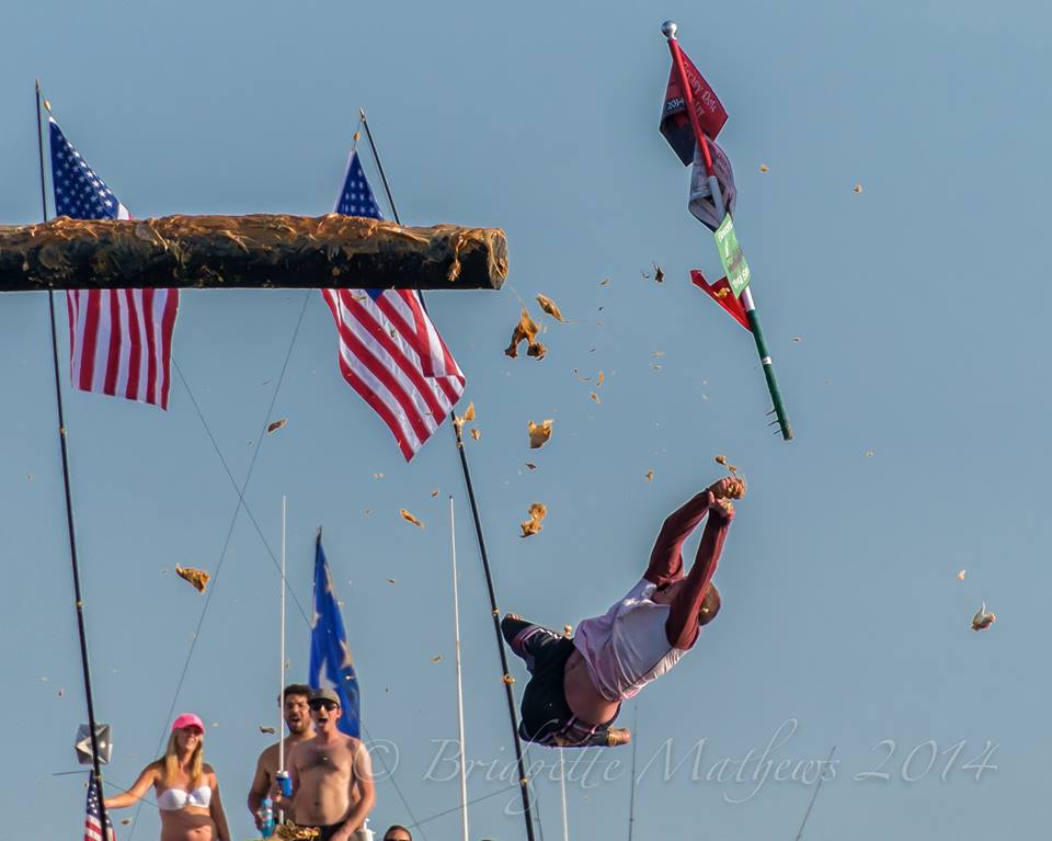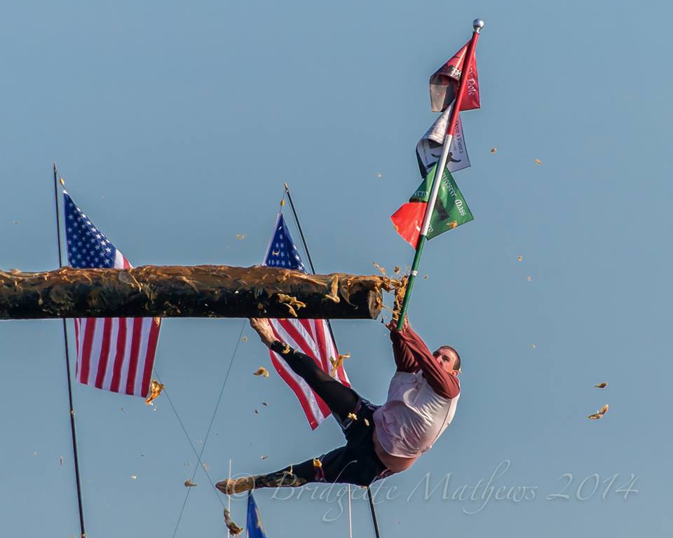 My dear friend Bridget Mathews Shares her amazing photos of Sunday Greasy Pole Champ Mark Allen and Saturday winner Kyle Barry capturing the prized flag made by brothers Thomas and Peter Favazza.