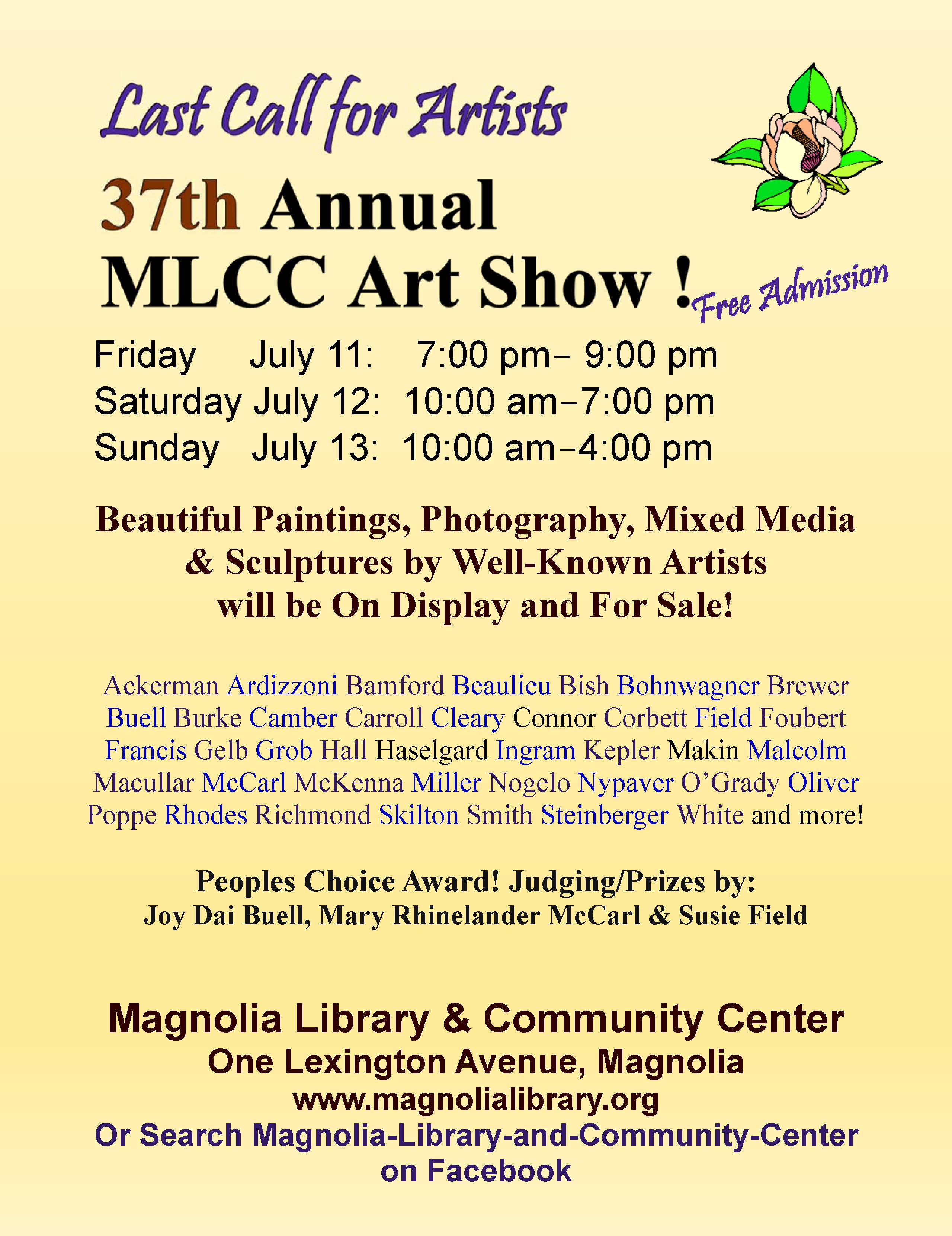 The popular 37th (!) Annual Magnolia Art Show & Sale will be accepting entries for a few more days. Please let your readers know! And please come to this show of beautiful works and support a local icon, the MLCC!
