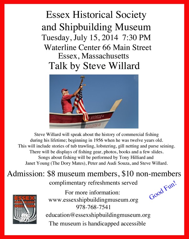 Steve Willard will speak about the history of commercial fishing during his lifetime; beginning in 1956 when he was twelve years old. This will include stories of tub trawling, lobstering, gill netting and purse seining. There will be displays of fishing gear, photos, books and a few slides. Songs about fishing will be performed by Tony Hilliard and Janet Young (The Dory Mates), Peter and Audi Souza, and Steve Willard.
