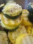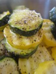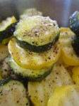 3 place cut zucchini and summer squash in mixing bowl; generously drizzle with ½ cup olive oil, sprinkling kosher salt and freshly ground pepper; mix well