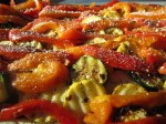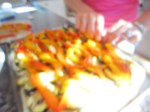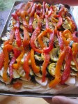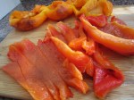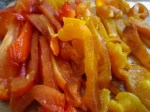 9 slice peppers into thin strips, reserve red and orange peppers separately