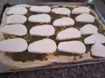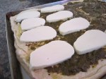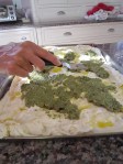 10 roll pizza dough out onto large cookie sheet; lightly drizzle top of dough with olive oil (aprox. 11/2 tablespoon); spread pesto evenly over dough