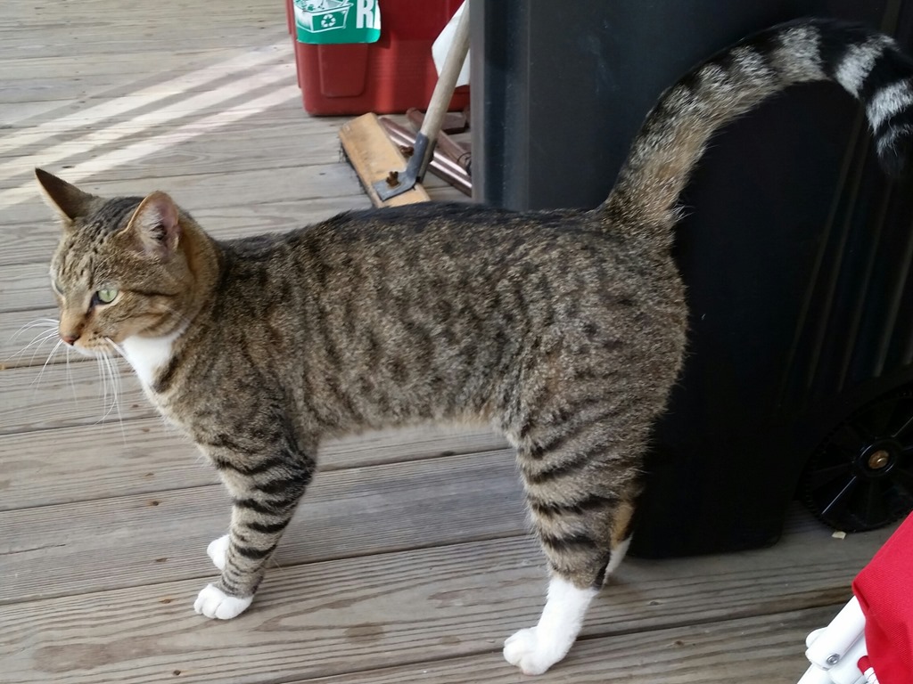 This sweet juvenile tabby cat showed up at my door this evening. (Thursday) He is a sweet, vocal tabby with white boots. He seems to be well cared for and lost, not a stray. Could you please share with your readers and help him find his way home?