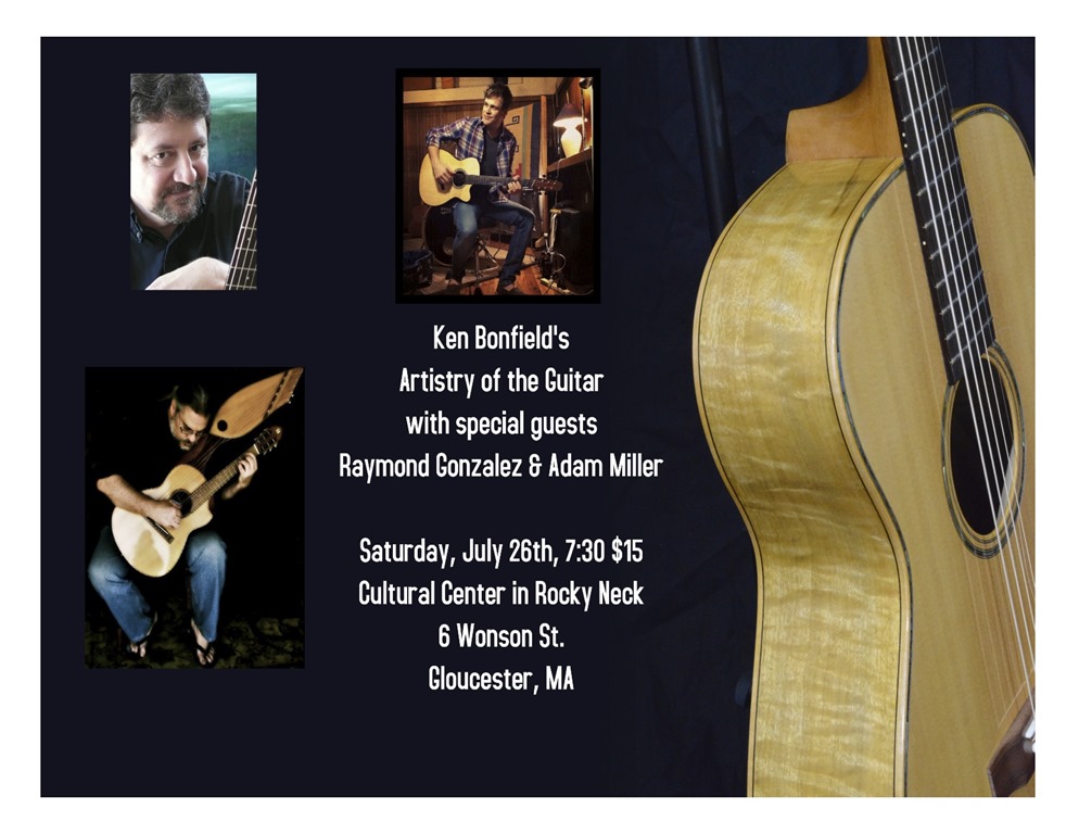 Gloucester MA— Gloucester resident, and master guitarist Ken Bonfield will host an Artistry of the Guitar in-the-round concerts at The Cultural Center in Rocky Neck, 6 Wonson St., Gloucester, MA on Saturday July 26th with special guests Cape Ann’s own Raymond Gonzalez and all the way from Australia, Adam Miller. The concert starts at 7:30pm and tickets are $15 at the door. Doors open at 7pm; there will be light refreshments. Each show will start with a short solo set from each artist followed by a short intermission and then a second set with all three guitarists in-the-round swapping songs and stories and sitting in on each others compositions.