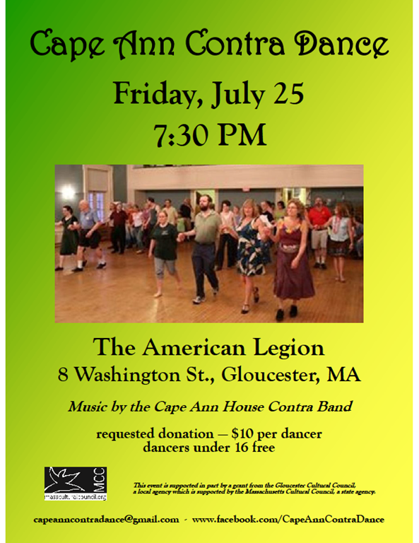 Everyone had such a good time dancing on the wooden floor at the American Legion that we’ll be back there again this Friday, July 25. The dancing gets underway promptly at 7:30 PM with live music by the Cape Ann House Contra Band. As always, we hope new dancers will join us. Everyone is welcome. No experience is necessary. All dances are taught.