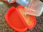 I remembered watching scrabbled eggs cook in a glass Pyrex liquid measuring cup quickly, effortlessly, and with little mess within minute’s right in the aisle of the appliance store. The very next morning, happened to be a Saturday, and I decided to replicate that same microwave egg demonstration to son BJ. He thought it was a genius approach of cooking fast with little mess to clean, and was happy with the results. For the next several days their “to go” breakfast wraps and sandwiches were prepared in this fashion, until I scored this nifty silicone omelet gadget made by Le’Kue’ on clearance for $8.00 in Marshalls the other day. This Silicone Omelet mold by Le’Kue’ has definitely made my morning job of fixing a hot “To Go” breakfast for my boys a lot faster and easier. I definitely give this kitchen gadget a two thumbs up for the ease of preparing eggs in an omelet style via the microwave.