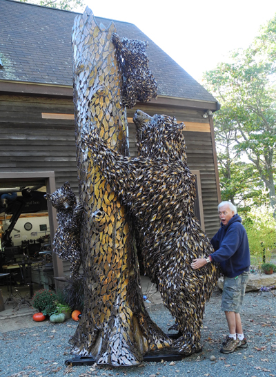 Fred Bodin gives the Kodiak Bear Family sculpture a “bear hug” during a special preview on the grounds of the Chris Williams sculpture studio in Essex, MA. I am 6’1″ tall, and males of this species of bear grow to over 10′ tall when standing on their hind legs. The tree the bear family is climbing is 17′ high. The Kodiak bear is to scale! Kodiak, or brown bears, are named after an island of the same name in Alaska.