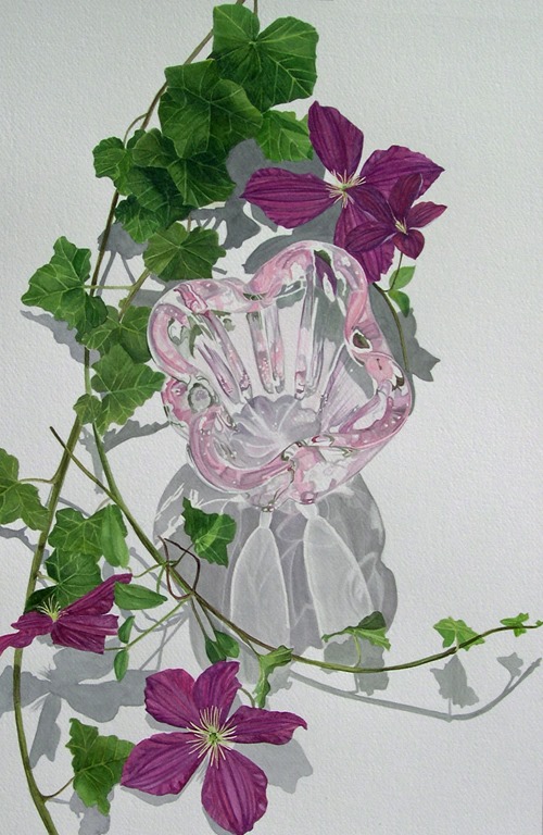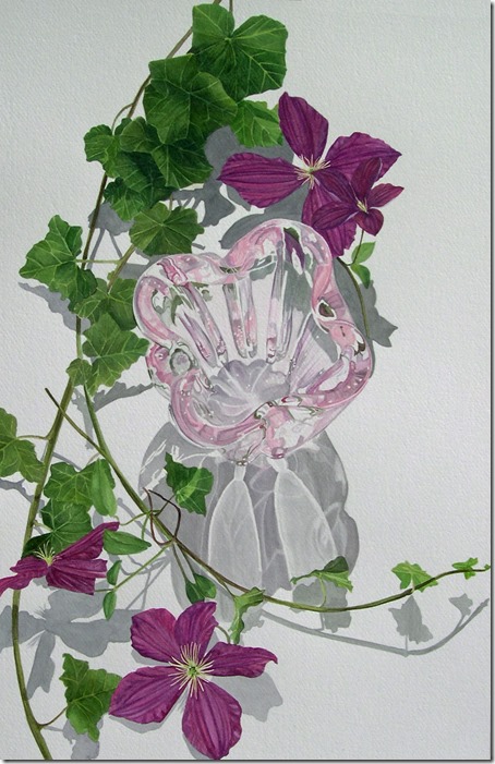 In Judy’s words, “I attempt to catch the moment when sunlight transforms a simple object into something wondrous. When a flower glows with inner light, a water droplet sparkles, or an intricate network of shadows is cast by a spray of leaves or the facets of a glass vase. Each of us see these things in our everyday life, but they are fleeting. I try to capture them and hold them for others to enjoy.” In viewing her works, the observer realizes just how well she succeeds. Meticulously rendered, they seem to be real – not painted – with a simplicity that belies just how intricate they really are.