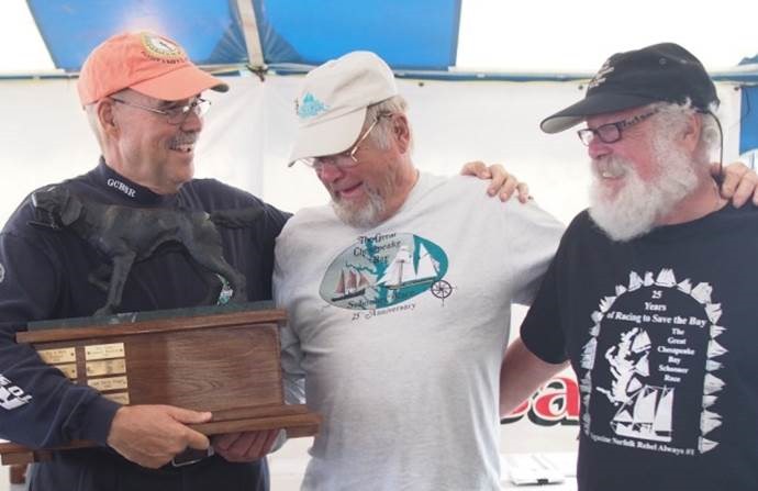 This year Jay Irwin received the Black Dog Trophy, created in 2006 to honor the individual(s) who supports the Great Chesapeake Bay Schooner Race in the spirit of Captain Lane Briggs (1932-2005), the founder of the GCBSR. Named after Captain Briggs’ faithful companion, Reb, this bronze statue of a black dog signifies loyalty to the race mission and faithful and honorable support for the event without personal recognition. In the words of Captain Briggs, “It’s amazing what you can get done if you don’t care who gets credit for it!”