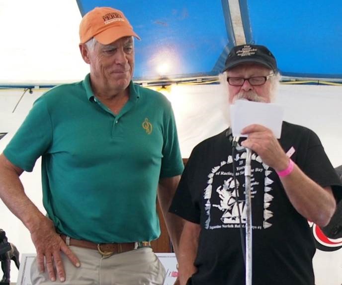 Capt. John Eginton with Pat Dutton of Mystic Whaler received the Rebel Educational Trophy, which balances the triad of the Great Chesapeake Bay Schooner Race: a valiant race down the length of the Chesapeake Bay; historical preservation of the schooner fleet; and an education program focused on the heritage, ecology and natural resources of the Chesapeake Bay. We all know that it takes an experienced crew to race a schooner under full sail, but often the educational program the schooner carries along goes unnoticed. The schooners participating in the education program spend untold hours planning, fundraising, training and executing their educational program. The Great Chesapeake Bay Schooner Race Educational Program Committee selects the schooner deserving recognition for their contribution to this essential element. It is the schooners’ educational programs that will perpetuate Captain Briggs’ vision of the Great Chesapeake Bay Schooner Race for generations to come.