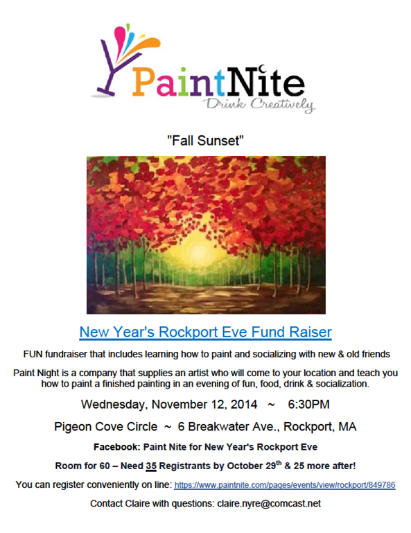 New Year’s Rockport Fundraiser, Paint Night, Wed. Nov 12th, 6:30 PM at the Pigeon Cove Circle, Rockport, MA. Paint Night is a company that supplies an artist who will come to your location and teach you how to paint a finished painting in an evening of fun, food, drink & socialization. We need 35 applicants by Oct. 29, but you can still register up to the day of. Pre-registration is required at https://www.paintnite.com/pages/events/view/rockport/849786. Contact Claire with questions: claire.nyre@comcast.net. Help New Year’s Rockport Eve dig out of debt from 2013 and prepare for 2014.