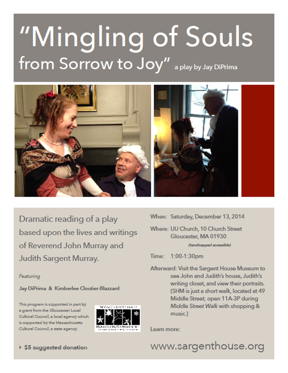 During the Middle Street Walk on December 13, the Gloucester Unitarian Universalist Church, 10 Church Street, will host a dramatic reading of Jay DiPrima’s one-act play “Mingling of Souls from Sorrow to Joy,” based on the lives and writings of Rev. John Murray and Judith Sargent Murray.