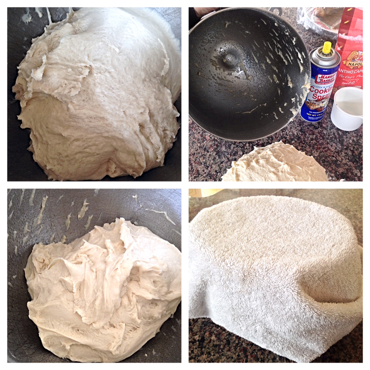 6 remove dough from mixing bowl; spray mixing bowl with cooking spray; return dough ball to mixing bowl; lightly spray top side of dough ball with cooking spray; cover with plastic wrap and dish towel; let rise 1 ½ hours or until dough doubles in size