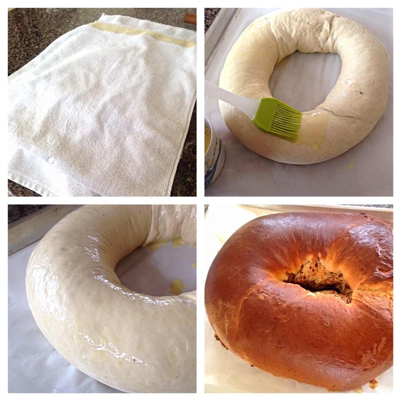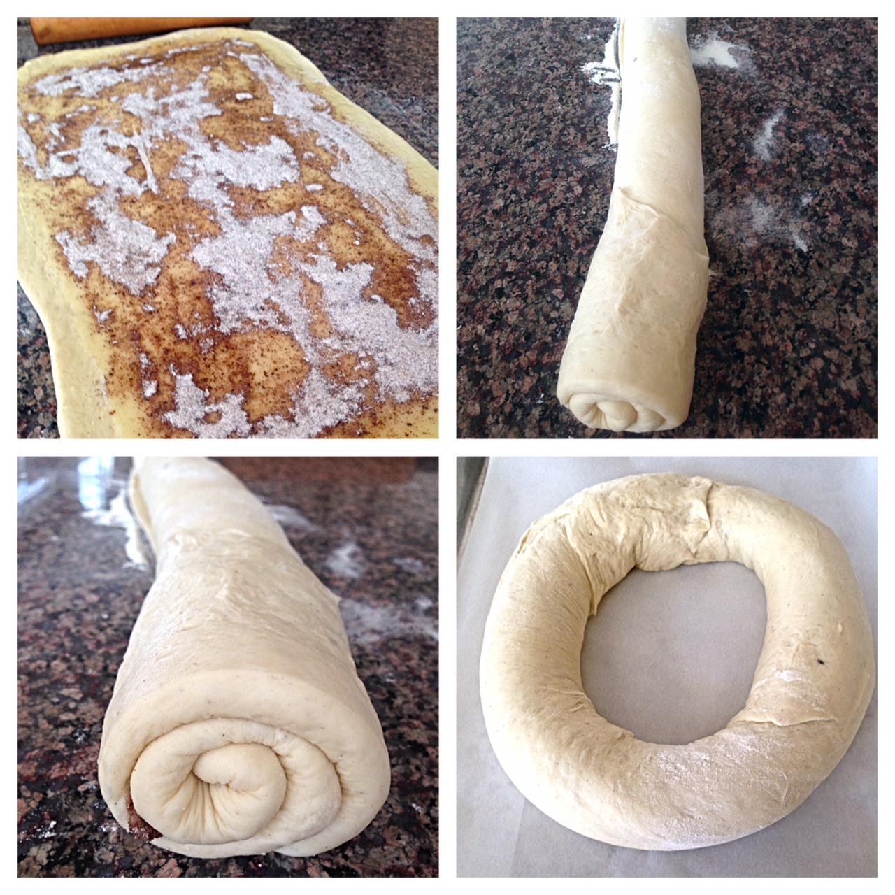 9 roll dough tightly into jelly-roll shape; carefully transferred dough to parchment paper lined cookie sheet; position dough into ring shape; seal dough ends together; cover with dish towel; rise 20 minutes