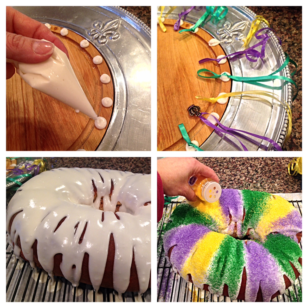 15 pipe remaining icing onto King Cake; alternating colored sugar crystals; transfer and nestle king cake onto serving platter adorned with ribbons and charms